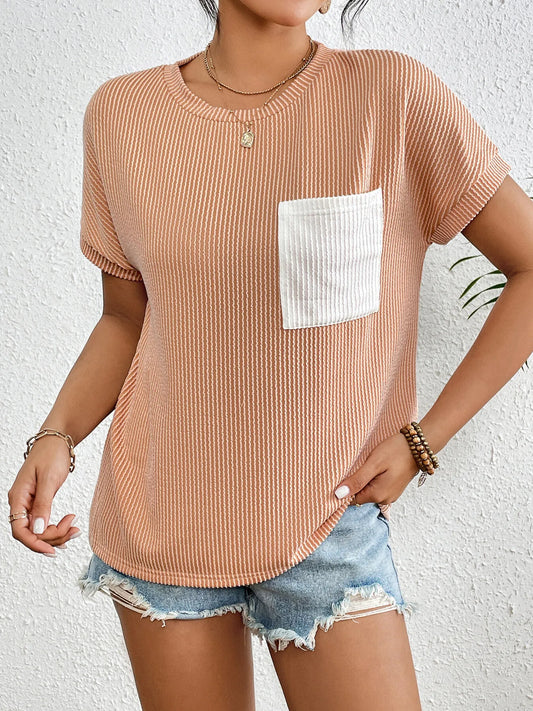 Ribbed Contrast Cuffed Round Neck Long Sleeve T Shirt